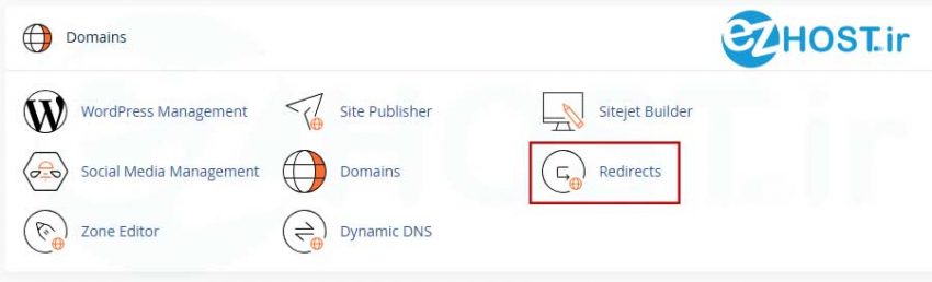 پس از ورود به داشبورد سی پنل، به بخش “Domains” بروید. در این قسمت، گزینهای با عنوان “Redirects” وجود دارد. روی آن کلیک کنید تا وارد صفحه تنظیمات ریدایرکت شوید.